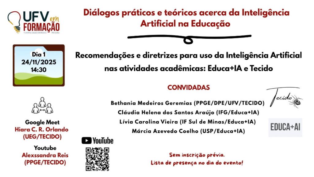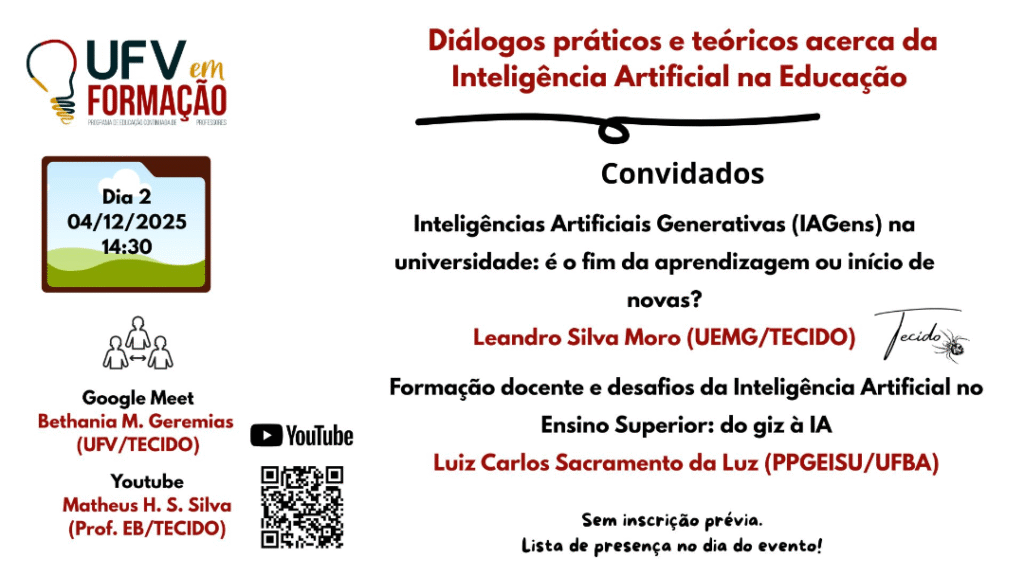 A formação será desenvolvida em dois dias (24/11 e 04/12), ambos das 14h30 às 16h30 e será transmitido pelo Youtube com apoio da CEAD no canal UFV EM FORMAÇÃO. A certificação referente a cada um dos dias do evento será mediante presença mínima de 2h por dia.