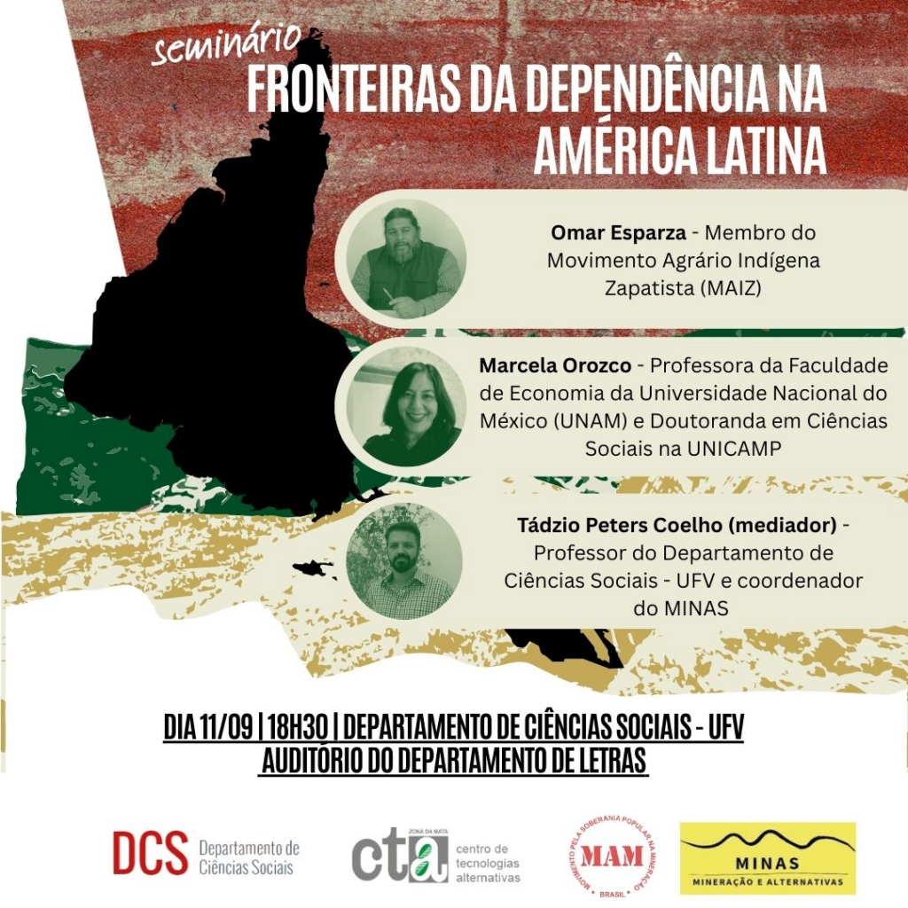 Os convidados do Seminário serão Marcela Orozco, professora da Faculdade de Economia da Universidade Nacional Autônoma do México, e Omar Esparza, integrante do Movimento Agrário Indígena Zapatista do México. O mediador será o professor do Departamento de Ciências Sociais da UFV Tádzio Coelho, que também coordena o grupo de pesquisa e extensão Mineração e Alternativas na Universidade.